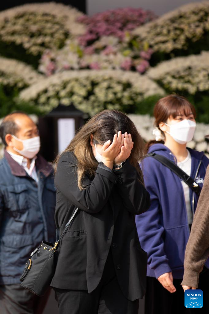 People holding flowers walk to a mourning altar set up at Seoul Plaza in Seoul, South Korea, Nov. 1, 2022. The death toll from a crowd crush, which occurred Saturday night at the Itaewon district of the South Korean capital Seoul during Halloween gatherings, rose overnight, the authorities said Tuesday. At least 156 people were killed and 151 others injured in the incident, according to the Ministry of the Interior and Safety. The government has announced a one-week national mourning period over the tragedy until Nov. 5. (Xinhua/Wang Yiliang)