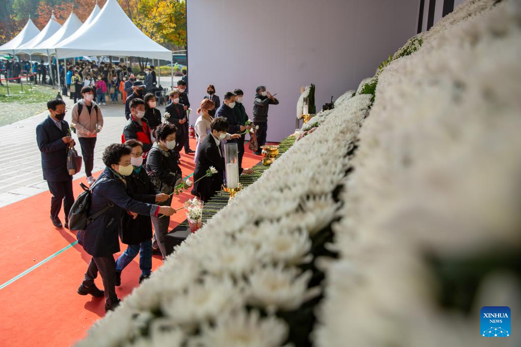 People lay flowers to a mourning altar set up at Seoul Plaza in Seoul, South Korea, Nov. 1, 2022. The death toll from a crowd crush, which occurred Saturday night at the Itaewon district of the South Korean capital Seoul during Halloween gatherings, rose overnight, the authorities said Tuesday. At least 156 people were killed and 151 others injured in the incident, according to the Ministry of the Interior and Safety. The government has announced a one-week national mourning period over the tragedy until Nov. 5. (Xinhua/Wang Yiliang)