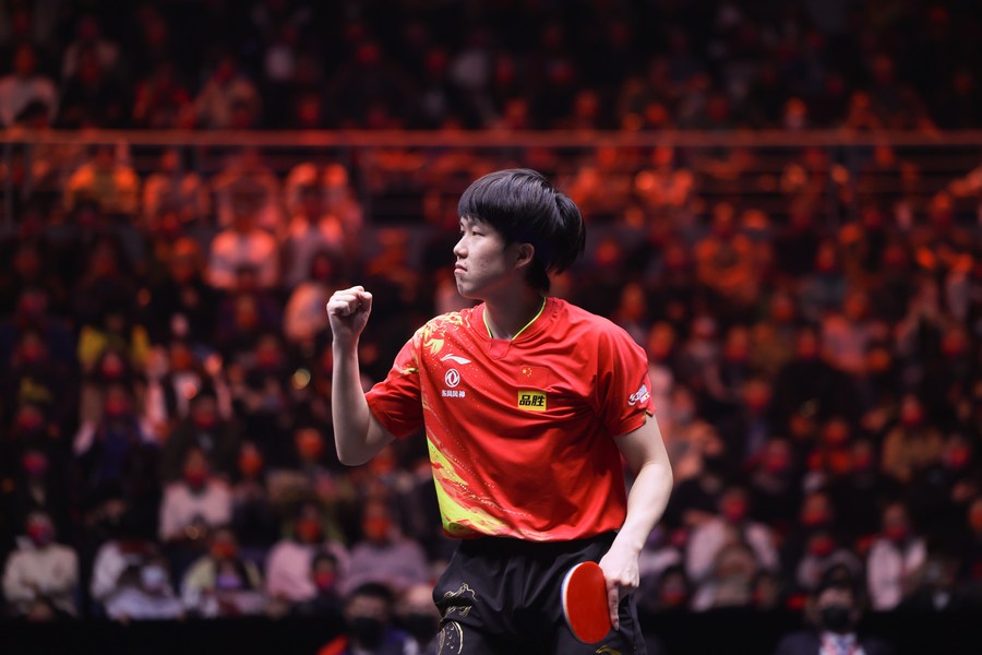 Sun Yingsha of China celebrates scoring during the women's singles final match against her teammate Chen Meng at the WTT Cup Finals. (Photo by Gao Zhiyong/Xinhua)