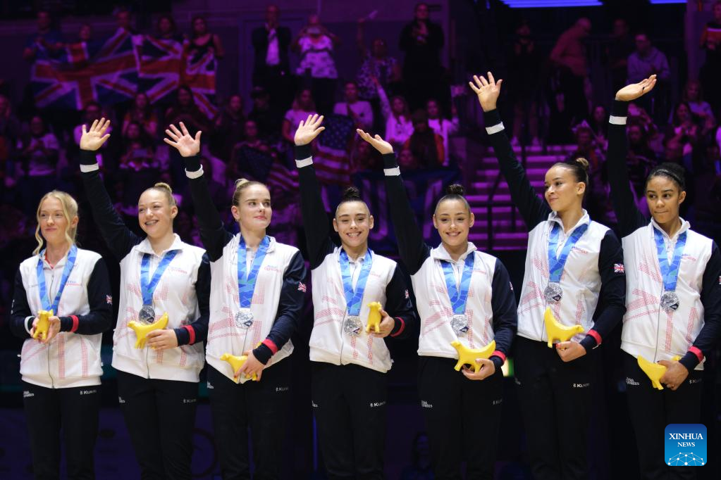 Silver medalists team Britain celebrate during the awarding ceremony of the women's team event at the 51st FIG Artistic Gymnastics World Championships in Liverpool, Britain, Nov. 1, 2022. (Xinhua/Meng Dingbo)