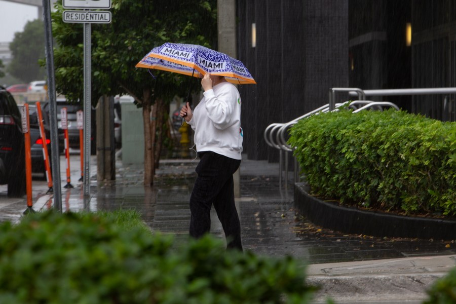 A woman walks in the rain in Miami, Florida, the United States, Sept. 27, 2022. (Photo by Monica McGivern/Xinhua)