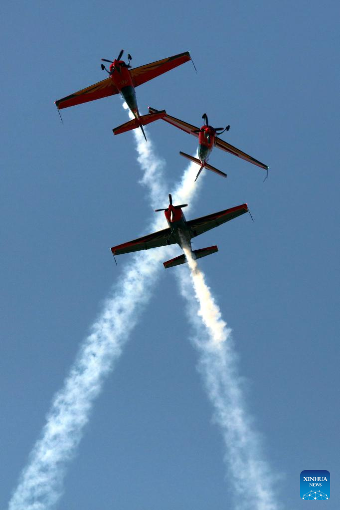 Aircraft from the Royal Jordanian Falcons perform during an airshow of the 13th Special Operations Forces Exhibition and Conference (SOFEX) in Aqaba, Jordan, on Nov. 1, 2022. The 13th Special Operations Forces Exhibition and Conference (SOFEX) kicked off in Jordan's Aqaba on Tuesday with the participation of more than 300 companies from 38 countries. (Photo by Mohammad Abu Ghosh/Xinhua)