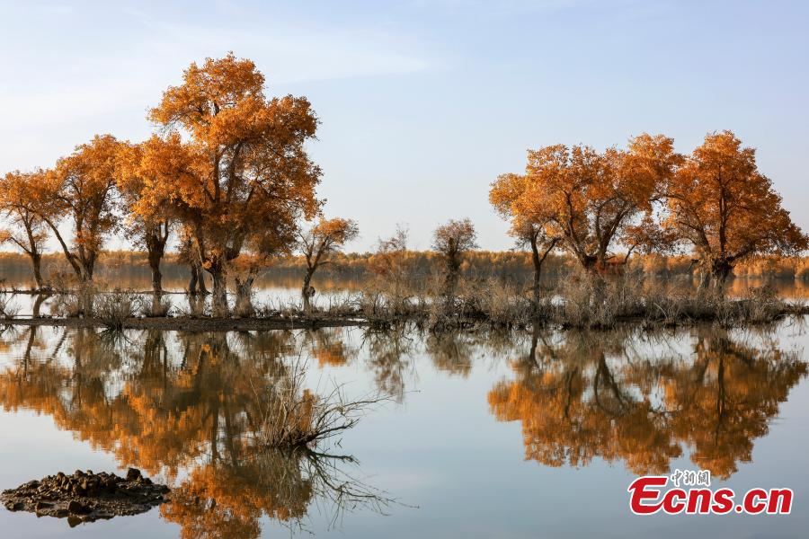 Stunning autumn scenery of desert poplar trees, also known as populus euphratica, along the Tarim River in Xayar County, northwest China's Xinjiang Uyghur Autonomous Region. Covering an area of nearly 313,333 hectares, the golden populus euphratica forest in Xayar County brings vitality to the arid desert. (Photo: China News Service/Liu Yuzhu)