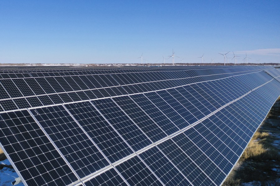 This photo taken on Dec. 3, 2021 shows a photovoltaic power station in Wulanhua Town, Baicheng City of northeast China's Jilin Province. (Photo by Zhang Yubo/Xinhua)