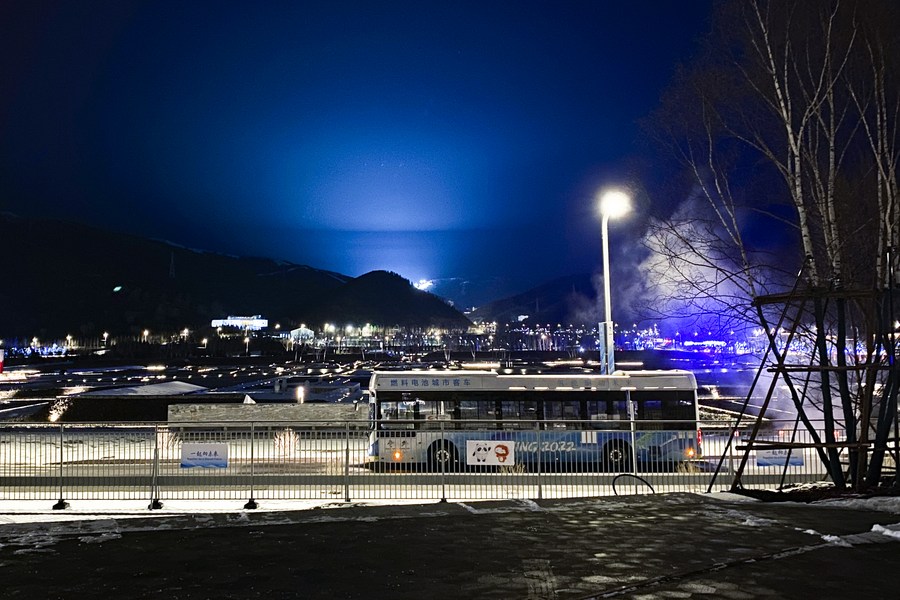 A fuel cell ferry bus runs during the Beijing 2022 Winter Olympics in Zhangjiakou, north China's Hebei Province, Feb. 12, 2022. (Xinhua/Xu Chang)