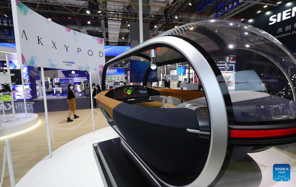 This photo taken on Nov. 2, 2022 shows an exhibit embodying the Japan's chemical company Asahi Kasei's concept of the future automotive interiors in the main venue for the upcoming fifth China International Import Expo (CIIE) in east China's Shanghai. Preparations for the CIIE, which will be held in Shanghai from Nov. 5 to 10, have entered the final stage. (Xinhua/Fang Zhe)