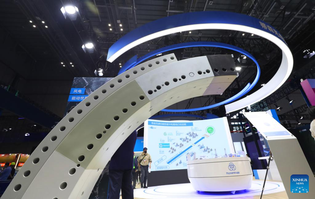 This photo taken on Nov. 2, 2022 shows the exhibition booth of Thyssenkrupp AG, a German steel producer company, in the main venue of the upcoming fifth China International Import Expo (CIIE) in east China's Shanghai. Preparations for the CIIE, which will be held in Shanghai from Nov. 5 to 10, have entered the final stage. (Xinhua/Fang Zhe)