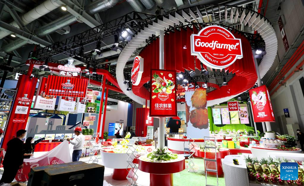 Workers set up the exhibition booth of Goodfarmer Group in preparation for the upcoming fifth China International Import Expo (CIIE) in east China's Shanghai, Nov. 2, 2022.