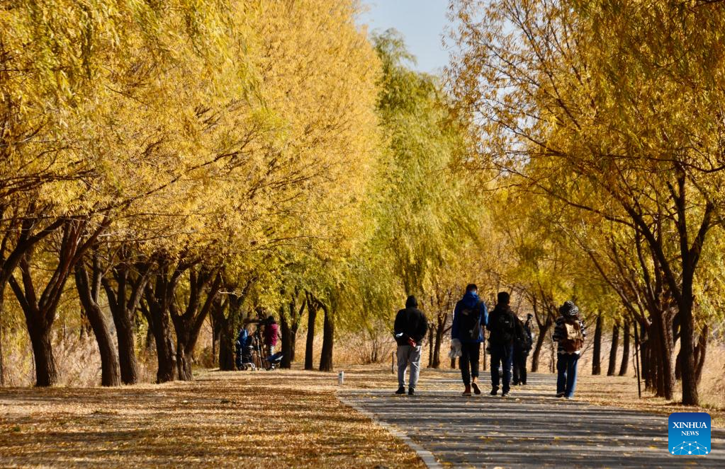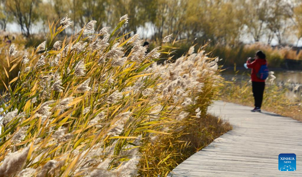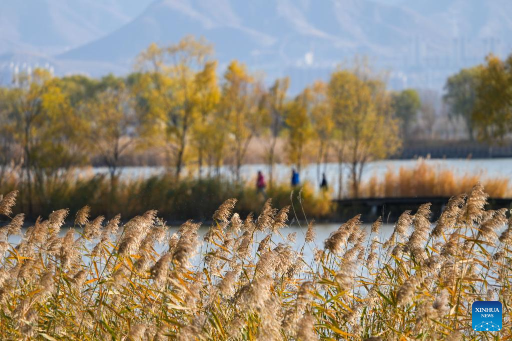 This photo taken on Nov. 1, 2022 shows people visiting the Yeya (Wild Duck) Lake national wetland park in Yanqing District of Beijing, capital of China. Yeya Lake Wetland Reserve became Beijing's first wetland conservation area in 1997. It functions as an ecological shield for Beijing, protecting the city's water source and providing a habitat for wild animals. (Xinhua/Ju Huanzong)