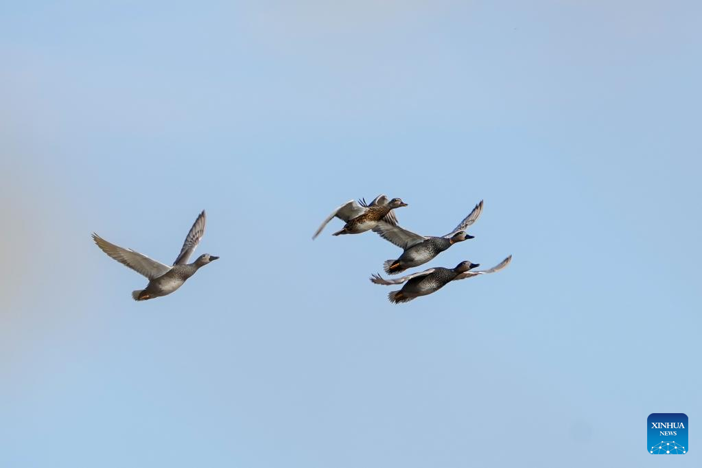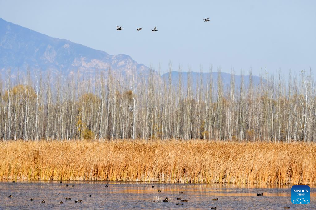 This photo taken on Nov. 1, 2022 shows a flock of gadwalls flying over the Yeya (Wild Duck) Lake national wetland park in Yanqing District of Beijing, capital of China. Yeya Lake Wetland Reserve became Beijing's first wetland conservation area in 1997. It functions as an ecological shield for Beijing, protecting the city's water source and providing a habitat for wild animals. (Xinhua/Ju Huanzong)