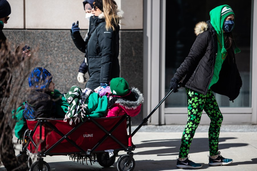 A woman dressed in green pulls a wagon with children in Chicago, the United States, on March 12, 2022. (Photo by Vincent D. Johnson/Xinhua)