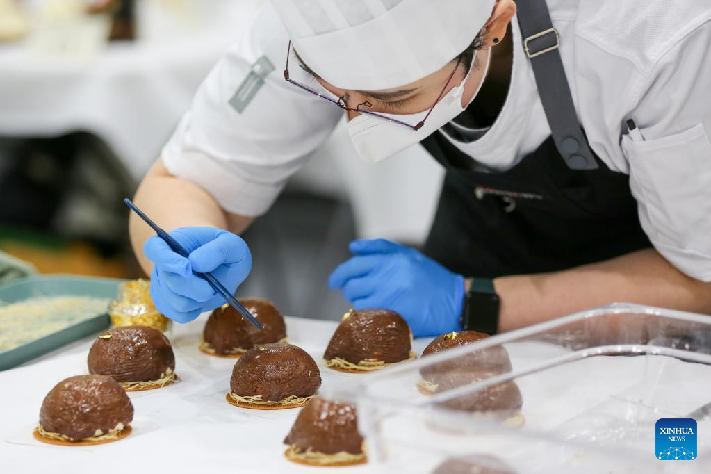 A chef makes desserts during the Coex Food Week 2022 in Seoul, South Korea, Nov. 2, 2022. The event kicked off in Seoul on Wednesday. (Xinhua/Wang Yiliang)