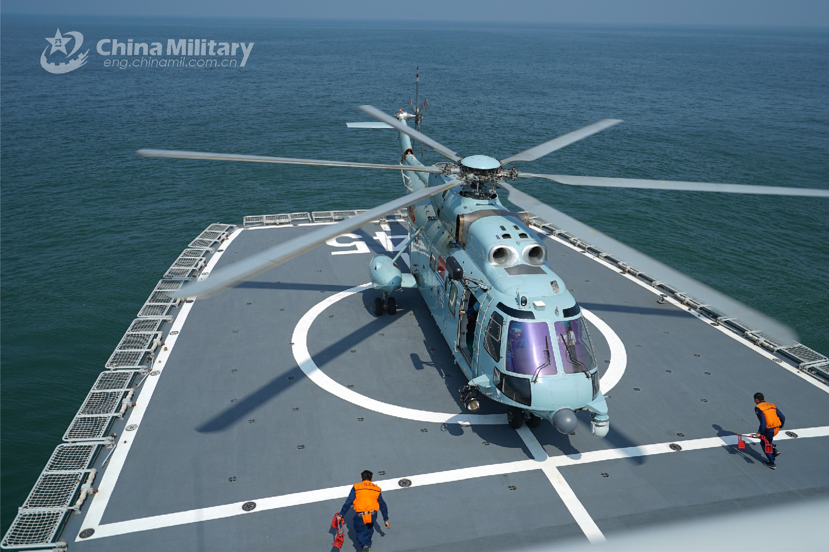 A ship-borne helicopter attached to a naval aviation regiment under the PLA Northern Theater Command lands on the deck of a rescue and salvage vessel attached to a salvage ship floti lla during their joint real-combat rescue exercise on October 8, 2022. (eng.chinamil.com.cn/Photo by Ma Yingming)