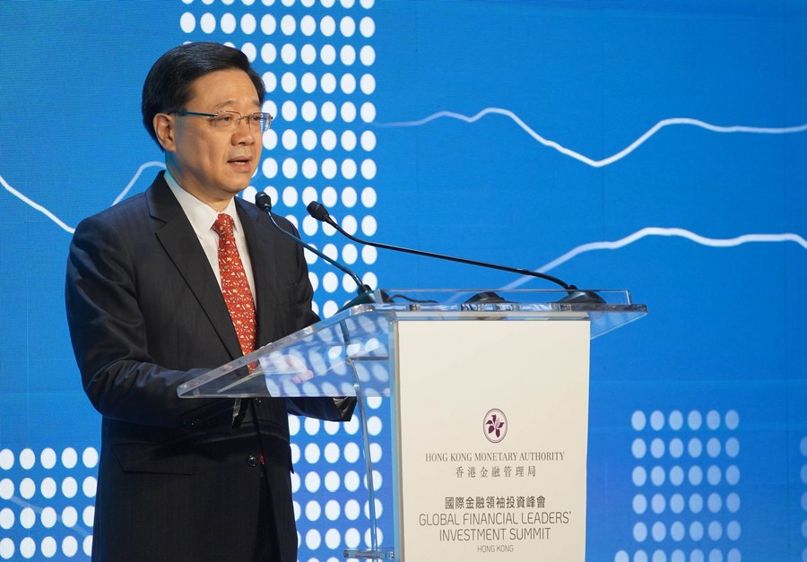 John Lee, chief executive of the Hong Kong Special Administrative Region, addresses the Global Financial Leaders' Investment Summit in south China's Hong Kong, Nov. 2, 2022. (Xinhua/Lui Siu Wai)