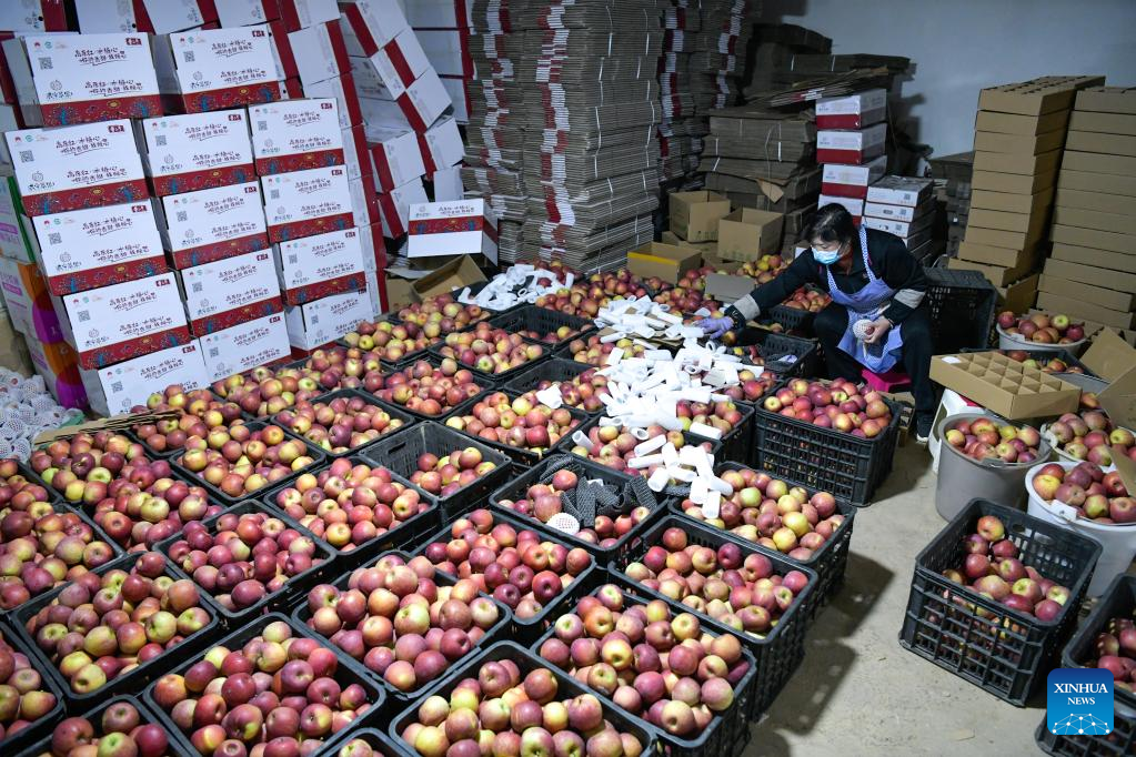 A farmer packs apples at a cooperative in Niupeng Townip of Weining Yi, Hui and Miao Autonomous County, southwest China's Guizhou Province, Nov. 2, 2022. Weining County, with its natural advantages of high sea-level, low-latitude, long sun-exposure time and large temperature difference in day and night, has developed apple planting that brought wealth to local people. (Xinhua/Yang Wenbin)