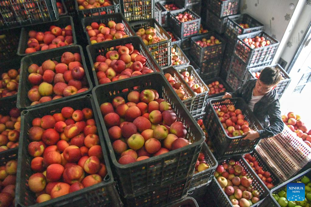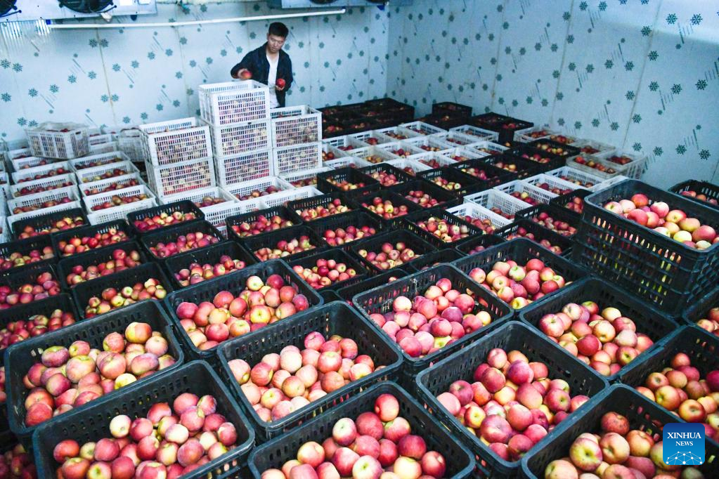 A farmer checks apples at a cold storage warehouse in Zhongshui Township of Weining Yi, Hui and Miao Autonomous County, southwest China's Guizhou Province, Nov. 3, 2022. Weining County, with its natural advantages of high sea-level, low-latitude, long sun-exposure time and large temperature difference in day and night, has developed apple planting that brought wealth to local people. (Xinhua/Yang Wenbin)