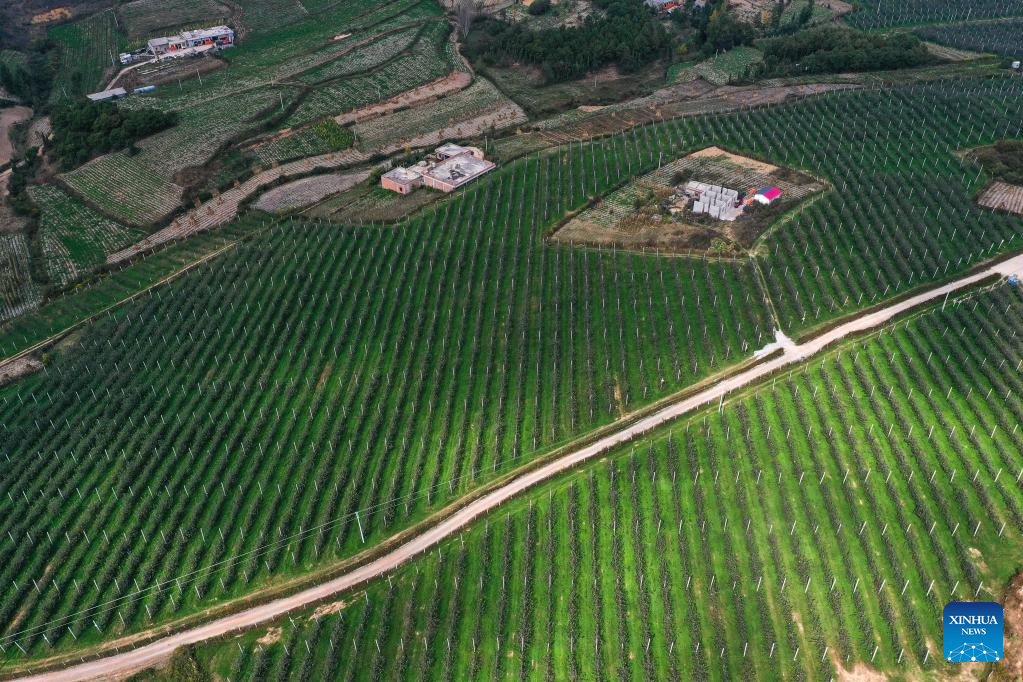 This aerial photo taken on Nov. 3, 2022 shows an apple orchard in Weining Yi, Hui and Miao Autonomous County of southwest China's Guizhou Province. Weining County, with its natural advantages of high sea-level, low-latitude, long sun-exposure time and large temperature difference in day and night, has developed apple planting that brought wealth to local people. (Xinhua/Yang Wenbin)