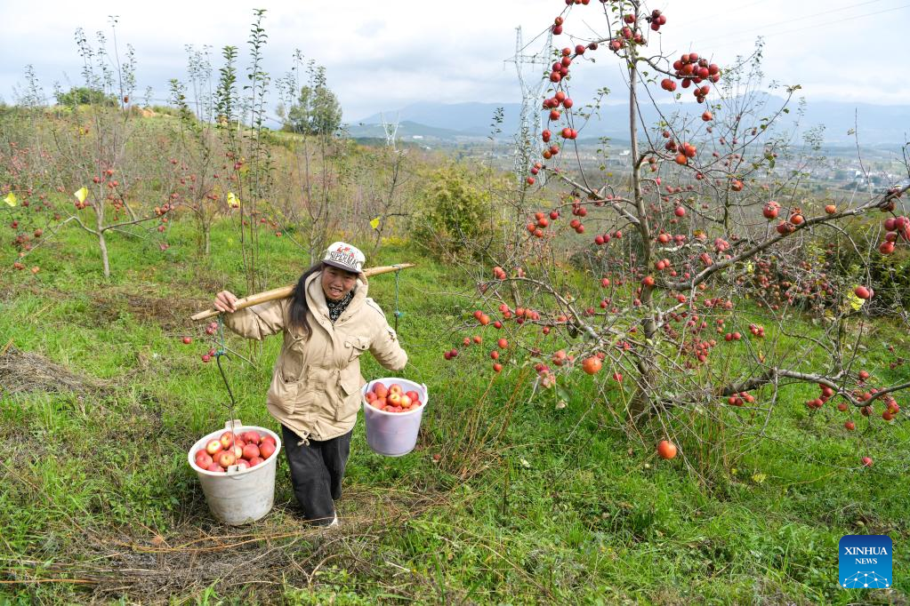 A farmer carries harvested apples at an orchard in Niupeng Township of Weining Yi, Hui and Miao Autonomous County, southwest China's Guizhou Province, Nov. 3, 2022. Weining County, with its natural advantages of high sea-level, low-latitude, long sun-exposure time and large temperature difference in day and night, has developed apple planting that brought wealth to local people. (Xinhua/Yang Wenbin)