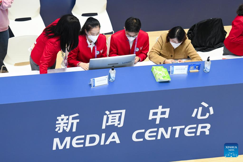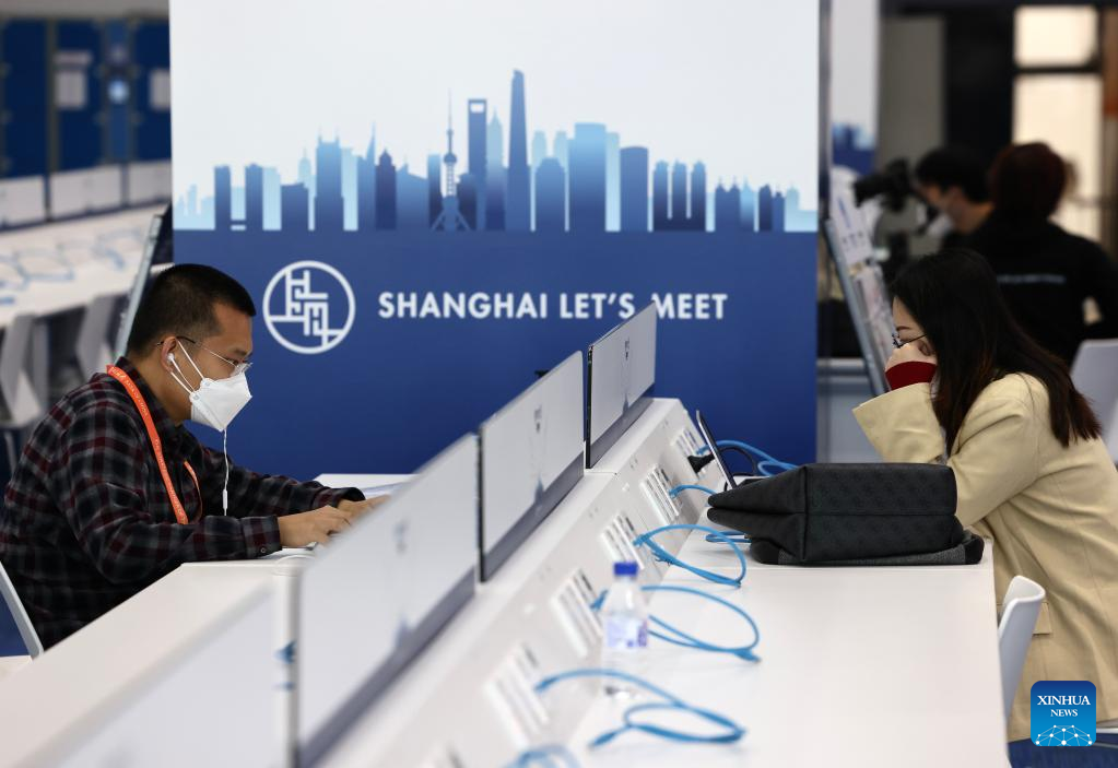 Staff members work at the media center of the 5th China International Import Expo (CIIE) at the National Exhibition and Convention Center (Shanghai) in Shanghai, east China, Nov. 4, 2022.