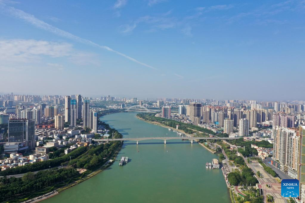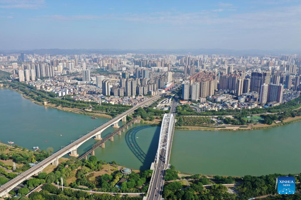 This aerial photo taken on Nov. 4, 2022 shows a cityscape on the banks of the Yongjiang River in Nanning, south China's Guangxi Zhuang Autonomous Region. (Xinhua/Lu Boan)