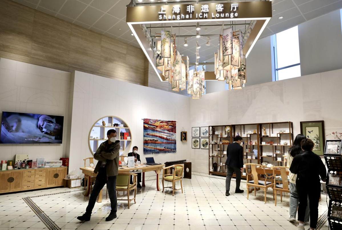 People look at the intangible cultural heritages in Shanghai ICH Lounge at the CIIE media center in Shanghai, Nov 4, 2022. [Photo by Zhang Wei/China Daily]