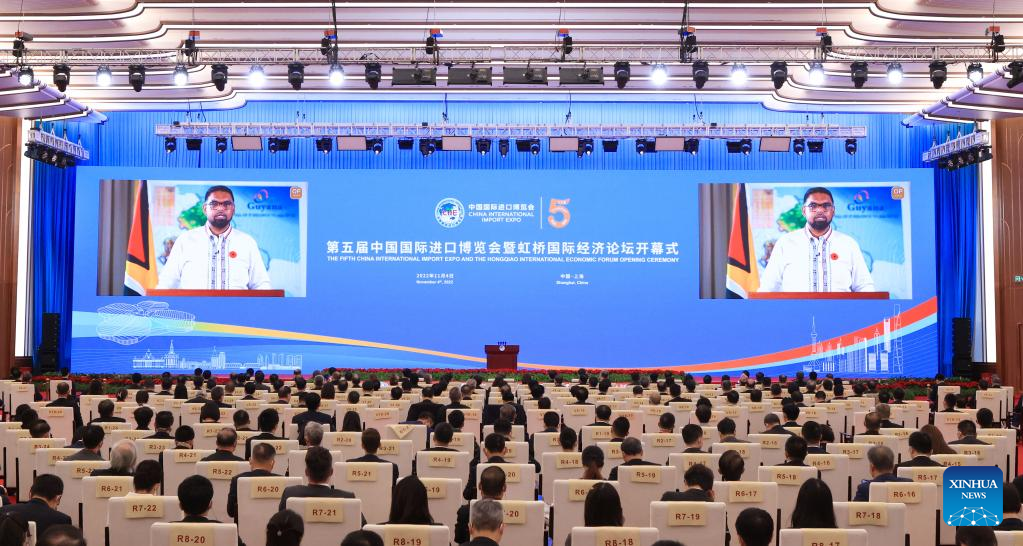 Guyanese President Irfaan Ali speaks via video at the opening ceremony of the fifth China International Import Expo held at the National Exhibition and Convention Center (Shanghai) in east China's Shanghai on Nov. 4, 2022. (Xinhua/Li Jing)