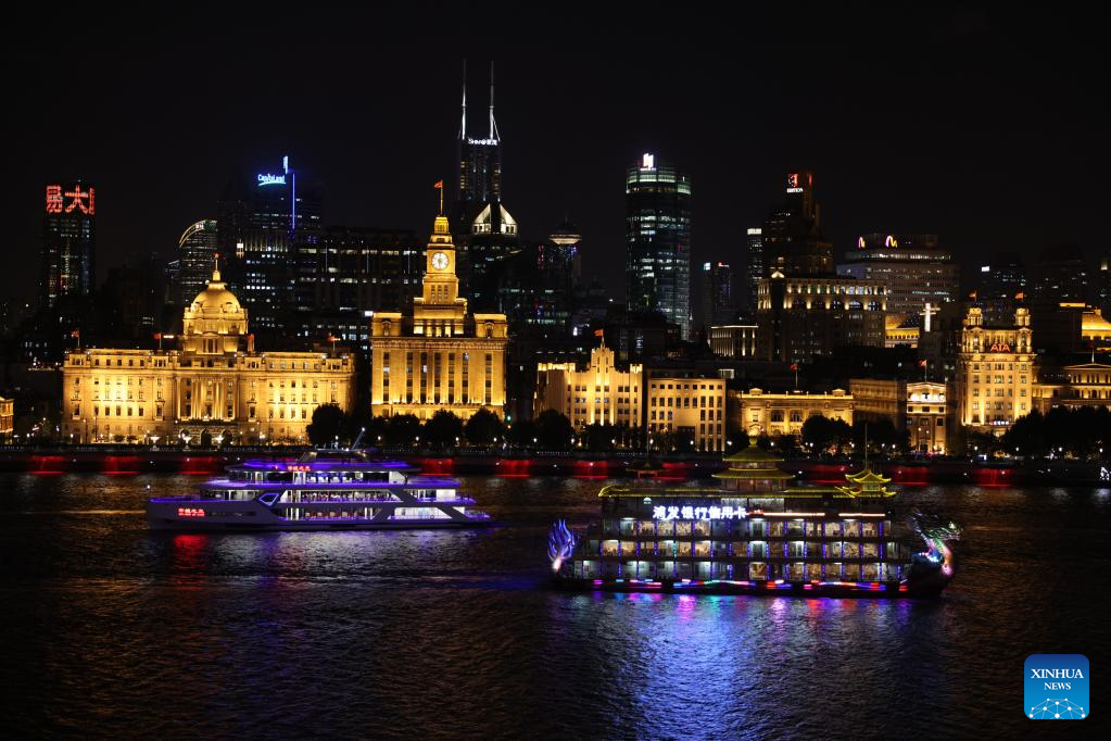 This photo taken on Nov. 4, 2022 shows an evening view at the Bund in east China's Shanghai. The fifth China International Import Expo (CIIE) is held in Shanghai from Nov. 5 to 10. (Photo by Ying Guowei/Xinhua)
