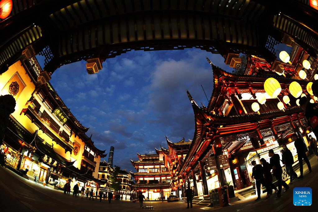 This photo taken on Nov. 4, 2022 shows an evening view of the Yuyuan Garden in east China's Shanghai. The fifth China International Import Expo (CIIE) is held in Shanghai from Nov. 5 to 10. (Xinhua/Zhang Jiansong)