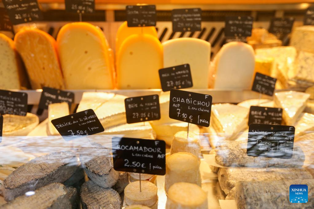 Dairy products and price tags are seen at a market in Brussels, Belgium, on Nov. 4, 2022. October's year-on-year inflation rate climbed to 10.7 percent in the eurozone, from 9.9 percent in September. (Xinhua/Zheng Huansong)