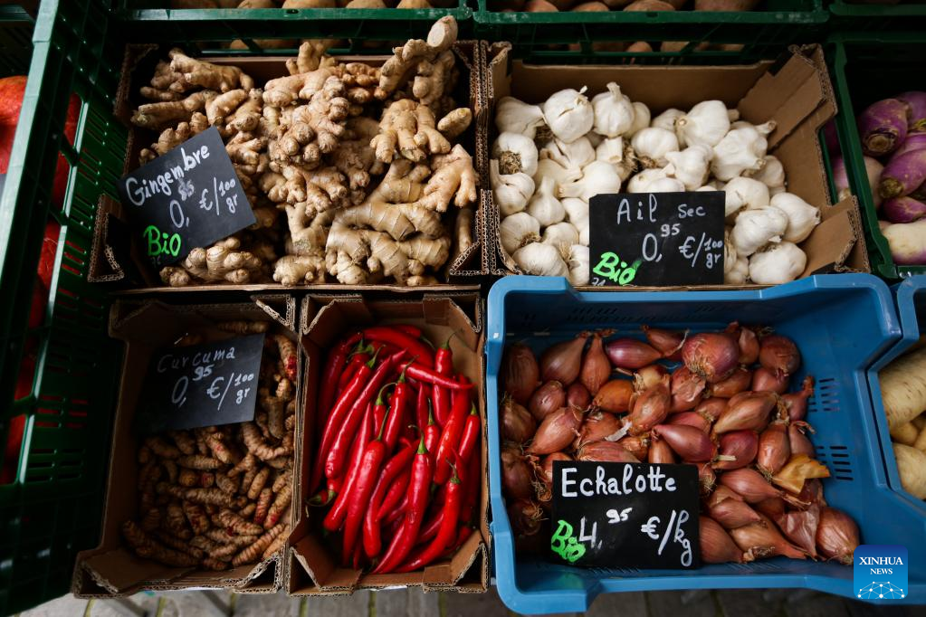 Vegetables and price tags are seen at a market in Brussels, Belgium, on Nov. 4, 2022. October's year-on-year inflation rate climbed to 10.7 percent in the eurozone, from 9.9 percent in September. (Xinhua/Zheng Huansong)