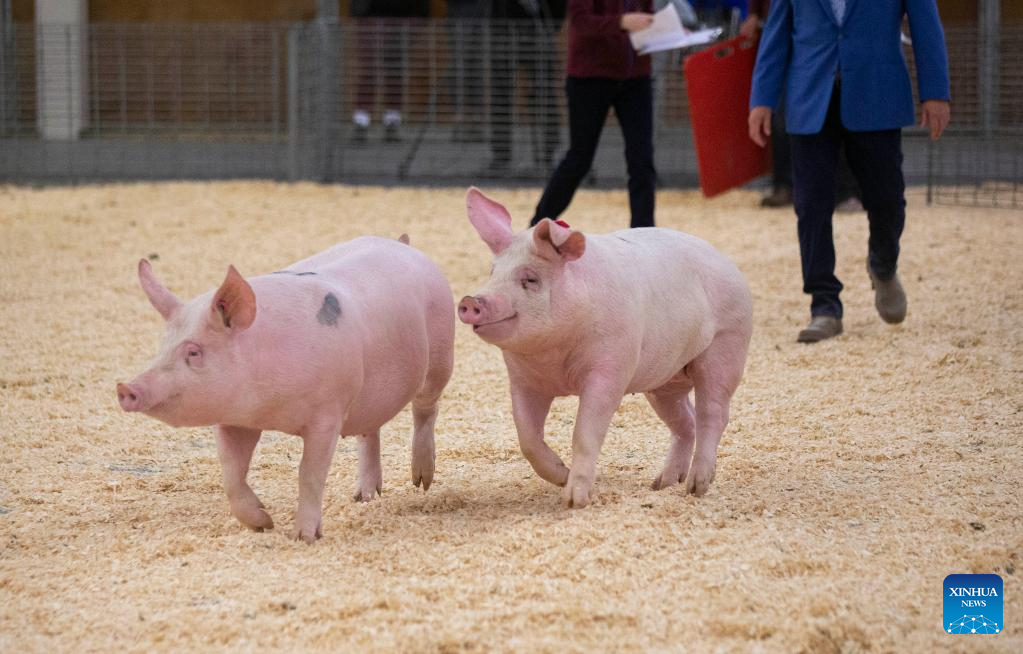 Pigs are seen during a junior swine show at the Royal Agricultural Winter Fair in Toronto, Canada, on Nov. 4, 2022. As a combined indoor agricultural fair and international equestrian competition, the ten-day annual event kicked off here on Friday to celebrate its 100th anniversary. (Photo by Zou Zheng/Xinhua)