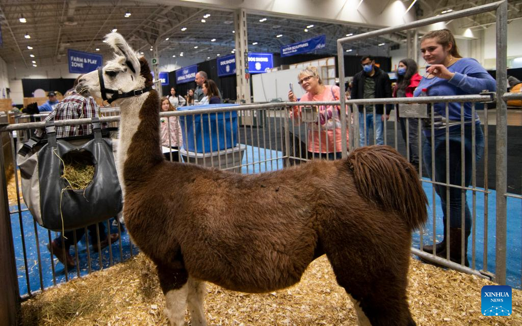 People look at a llama at the Royal Agricultural Winter Fair in Toronto, Canada, on Nov. 4, 2022. As a combined indoor agricultural fair and international equestrian competition, the ten-day annual event kicked off here on Friday to celebrate its 100th anniversary. (Photo by Zou Zheng/Xinhua)