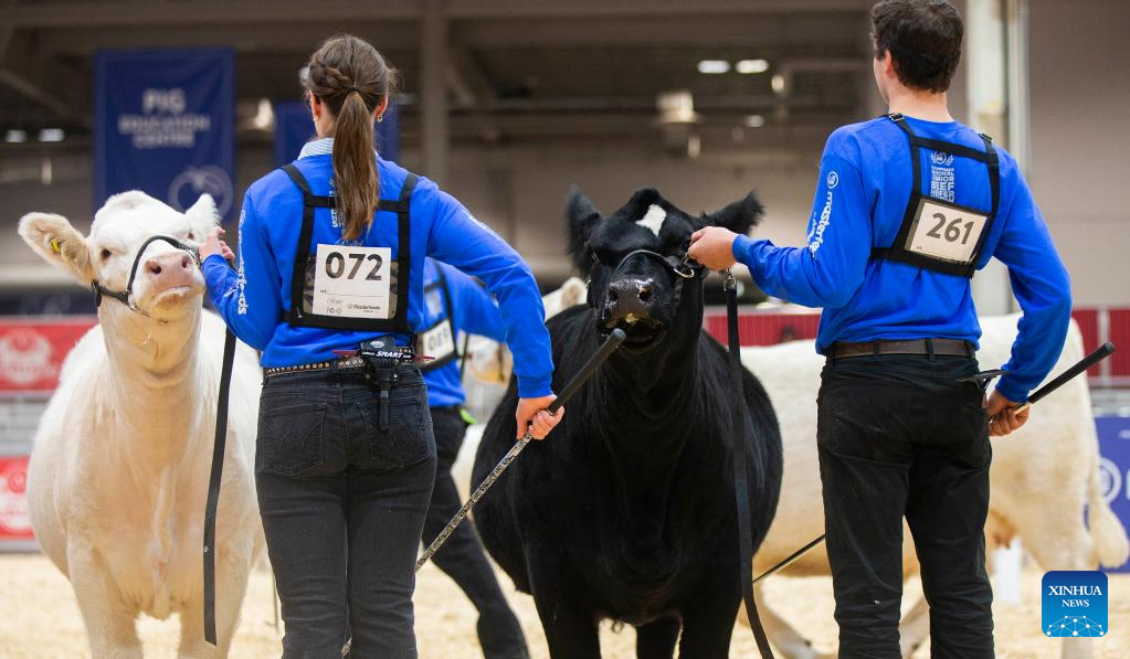 Breeders display their cows during a junior beef heifer show at the Royal Agricultural Winter Fair in Toronto, Canada, on Nov. 4, 2022. As a combined indoor agricultural fair and international equestrian competition, the ten-day annual event kicked off here on Friday to celebrate its 100th anniversary. (Photo by Zou Zheng/Xinhua)