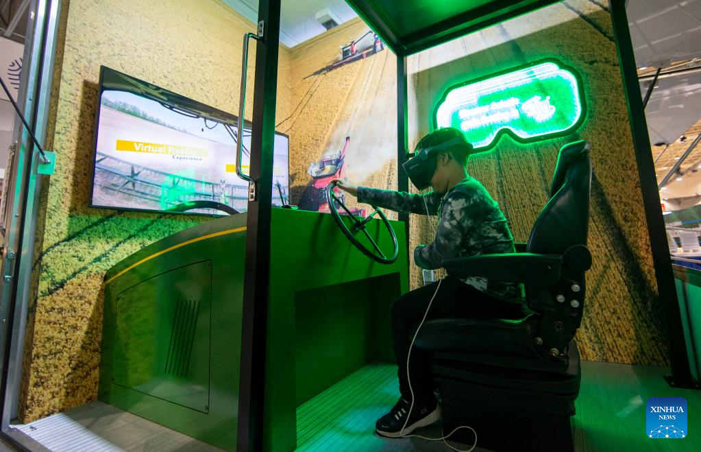 A boy has a VR experience of grain harvest at the Royal Agricultural Winter Fair in Toronto, Canada, on Nov. 4, 2022. As a combined indoor agricultural fair and international equestrian competition, the ten-day annual event kicked off here on Friday to celebrate its 100th anniversary. (Photo by Zou Zheng/Xinhua)