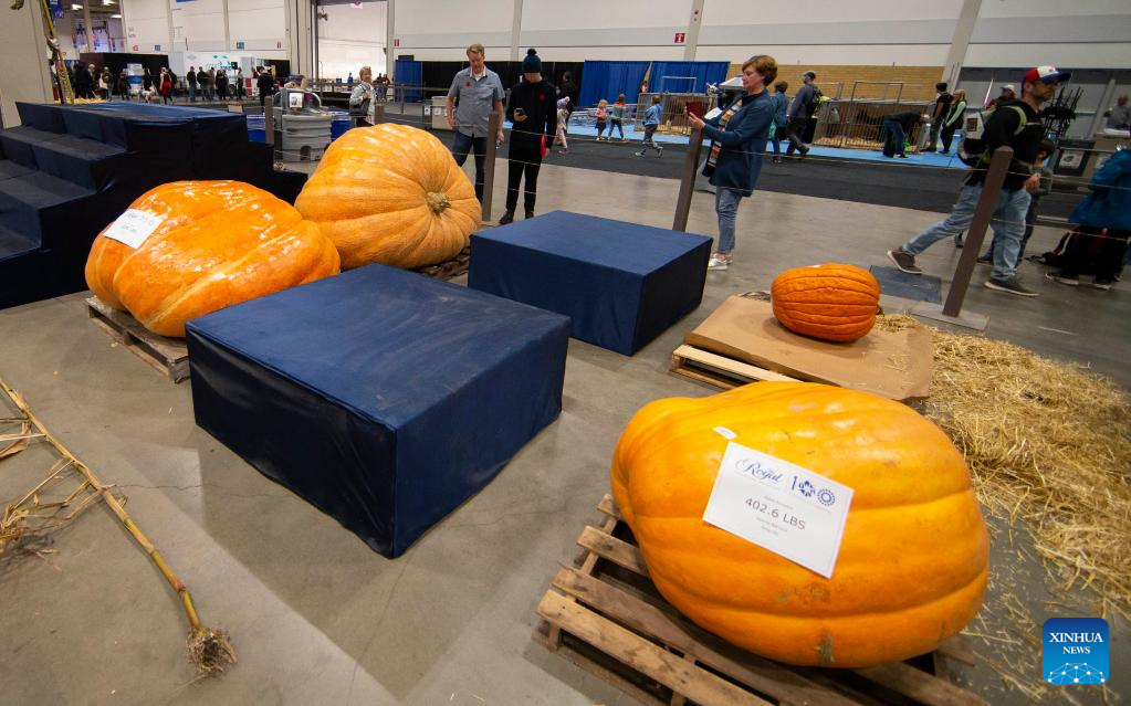 People look at giant pumpkins on display at the Royal Agricultural Winter Fair in Toronto, Canada, on Nov. 4, 2022. As a combined indoor agricultural fair and international equestrian competition, the ten-day annual event kicked off here on Friday to celebrate its 100th anniversary. (Photo by Zou Zheng/Xinhua)