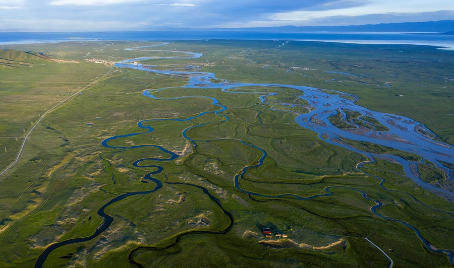This aerial photo taken on July 19, 2020 shows a view of Buh River wetland at Qinghai Lake in northwest China's Qinghai Province. (Photo by Yang Tao/Xinhua)