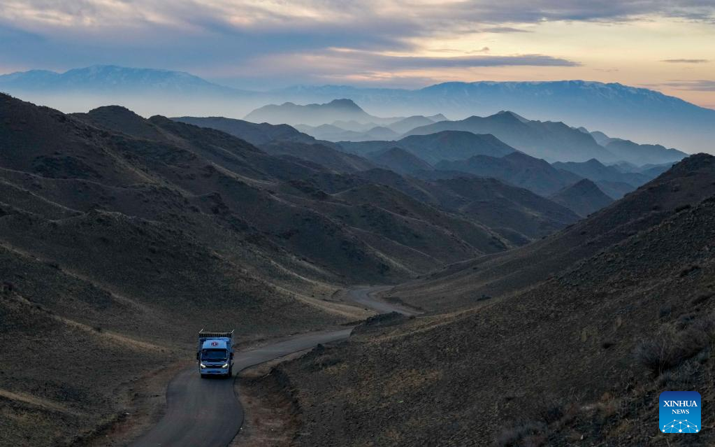 This photo taken on Nov. 4, 2022 shows a vehicle transferring livestock to the winter pastures in the Barlik Mountain area in Yumin County, northwest China's Xinjiang Uygur Autonomous Region.