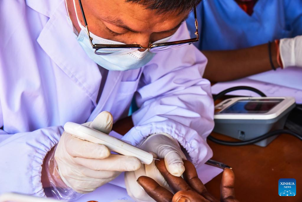 A Chinese doctor takes a blood sample from a patient in Bangou, Cameroon, Oct. 29, 2022.(Photo by Kepseu/Xinhua)