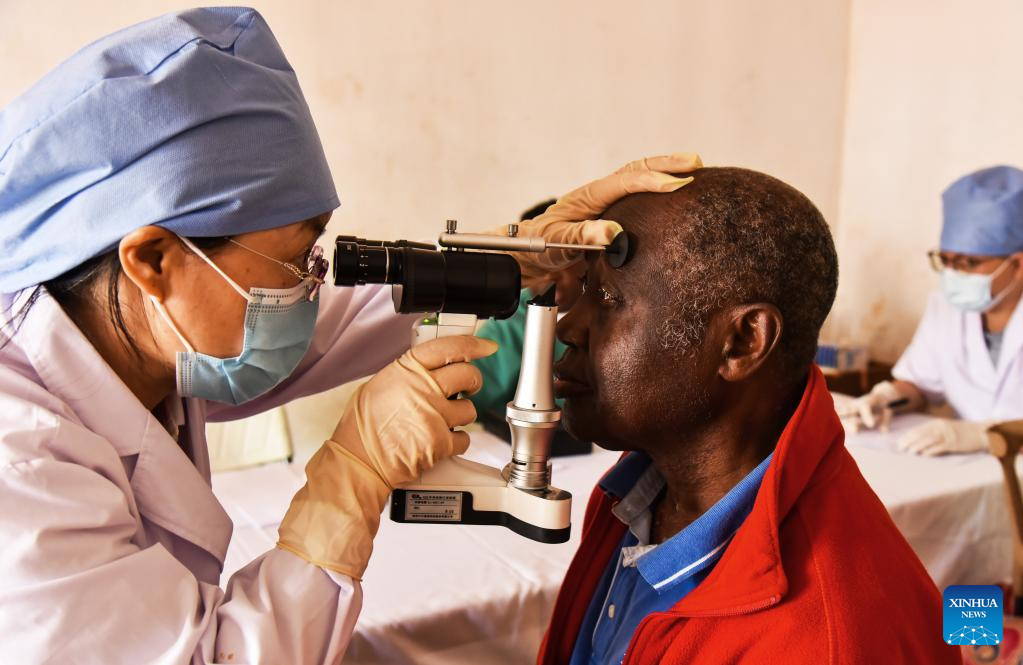 A Chinese ophthalmologist checks a patient's eyes in Bangou, Cameroon, Oct. 29, 2022.(Photo by Kepseu/Xinhua)