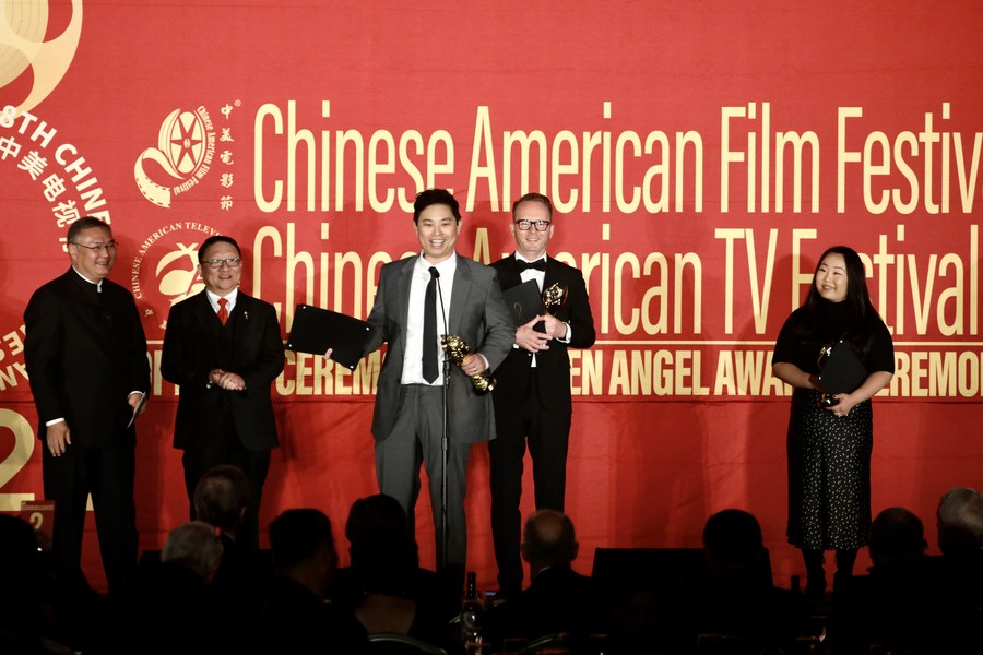 One of the honorees addresses the awarding ceremony at the 18th Chinese American Film Festival and the Chinese American Television Festival in Los Angeles, California, the United States, Nov. 4, 2022. (Xinhua)