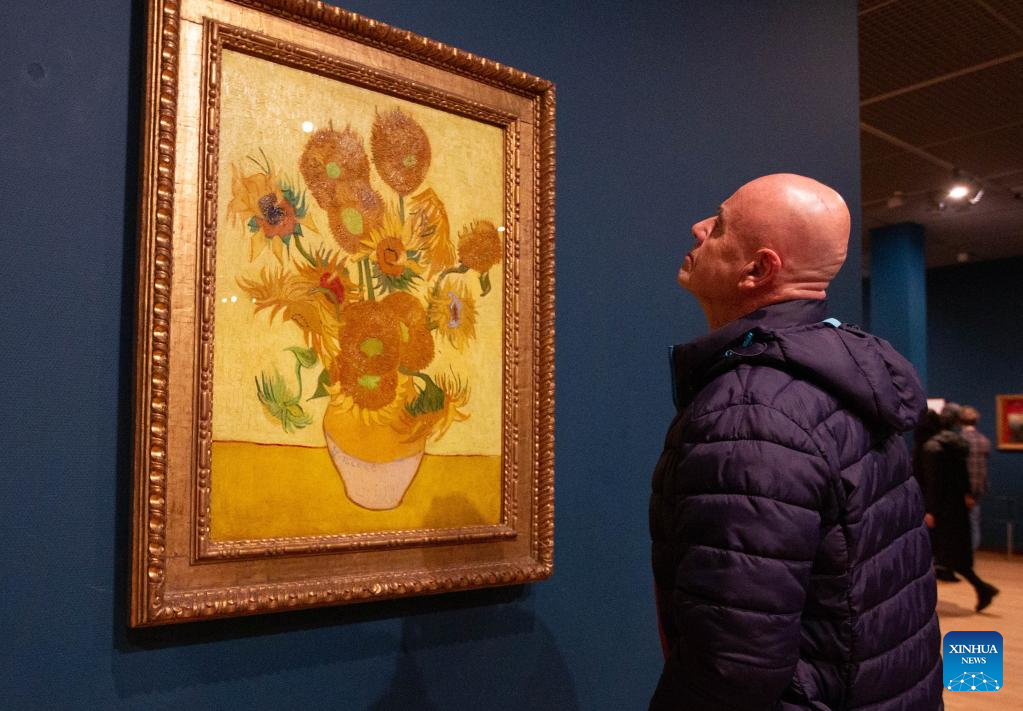 A man looks at an artwork by Van Gogh at the Van Gogh Museum in Amsterdam, the Netherlands, Nov. 5, 2022. Amsterdam Museum Night, an annual event which allows people to visit Amsterdam's museums during night time, kicked off here Saturday. (Photo by Sylvia Lederer/Xinhua)
