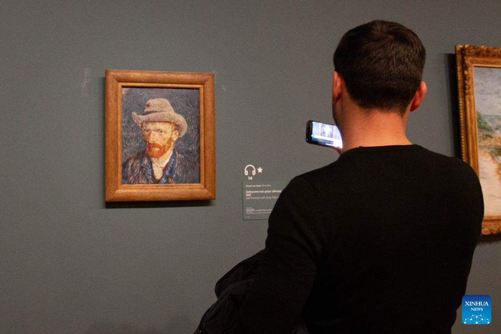 A man takes pictures of an artwork by Van Gogh at the Van Gogh Museum in Amsterdam, the Netherlands, Nov. 5, 2022. Amsterdam Museum Night, an annual event which allows people to visit Amsterdam's museums during night time, kicked off here Saturday. (Photo by Sylvia Lederer/Xinhua)