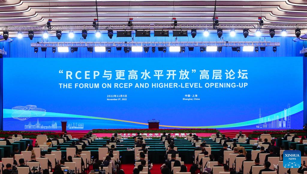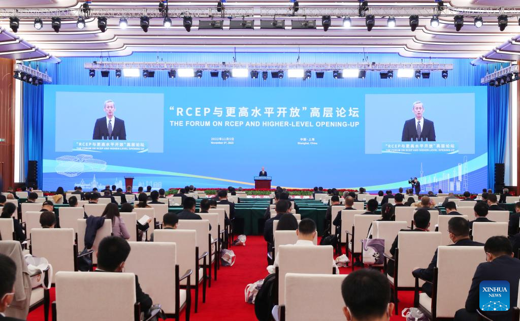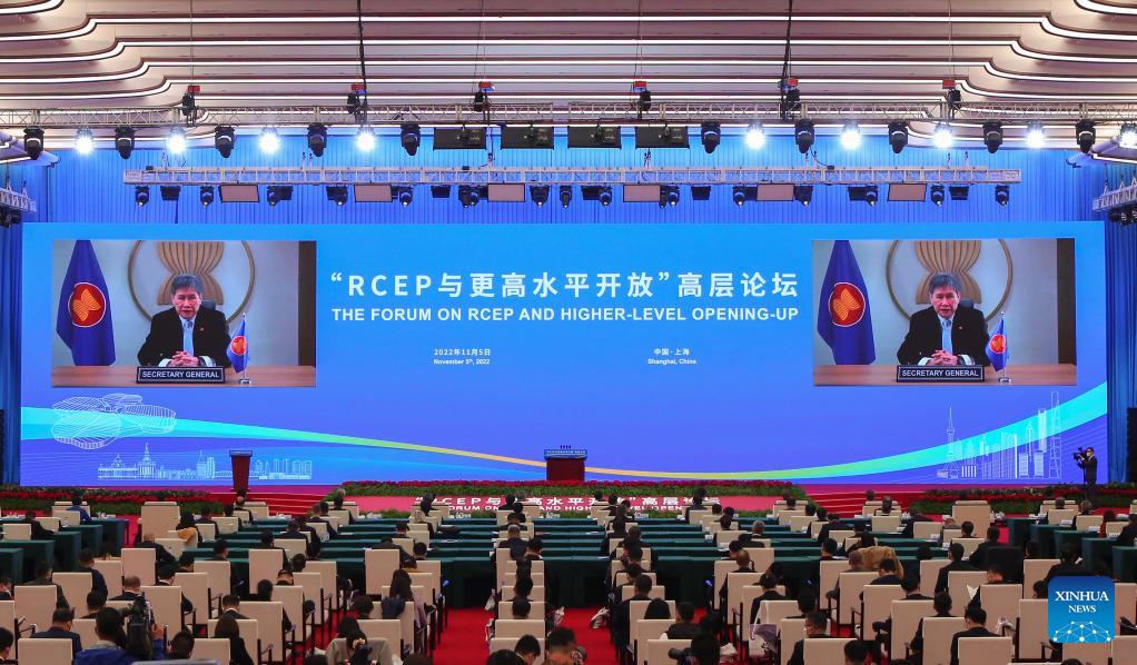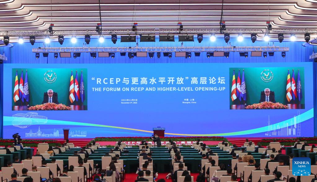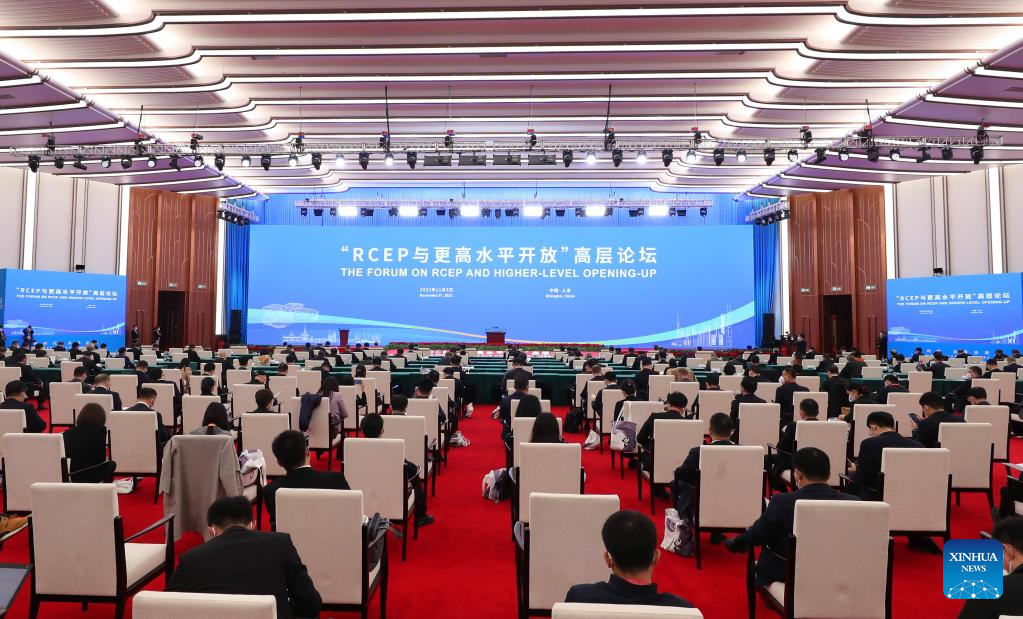 The Forum on the Regional Comprehensive Economic Partnership (RCEP) and Higher-level Opening-up is held in Shanghai, east China, Nov. 5, 2022. The session is a key event of this year's Hongqiao International Economic Forum. (Xinhua/Fang Zhe)