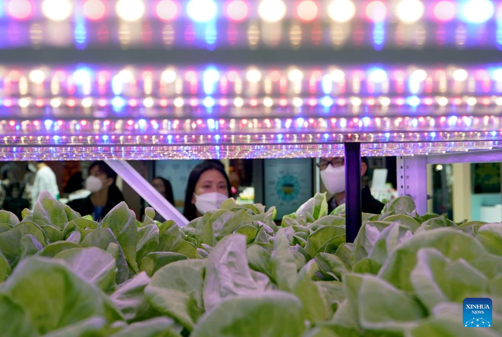Visitors view vegetables growing on shelves at the food and agricultural products exhibition area of the fifth China International Import Expo (CIIE) in east China's Shanghai, Nov. 7, 2022. A seedling company displays vegetables growing on shelves to demonstrate new technologies of smart agriculture during the fifth CIIE in Shanghai. (Xinhua/Liu Ying)