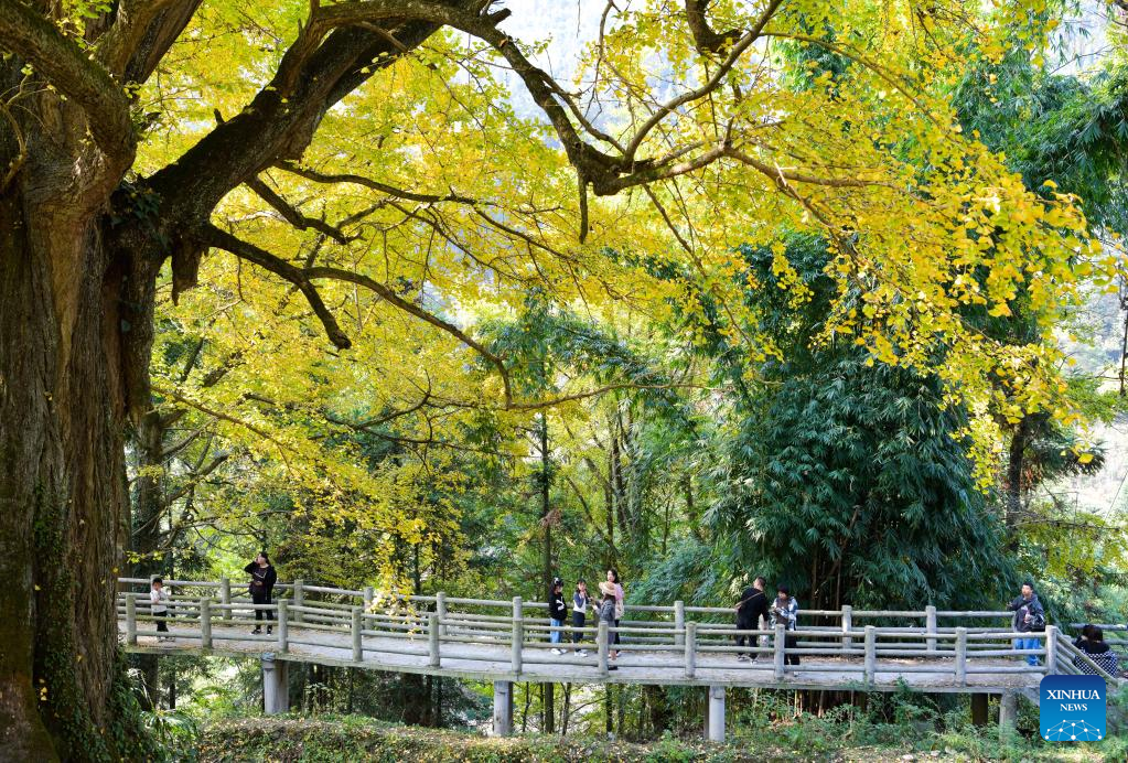 People enjoy leisure time on a bridge under a ginkgo tree with golden-yellow leaves in Huanglian Village of Wudang District in Guiyang, southwest China's Guizhou Province, Nov. 6, 2022. (Xinhua/Yang Wenbin)