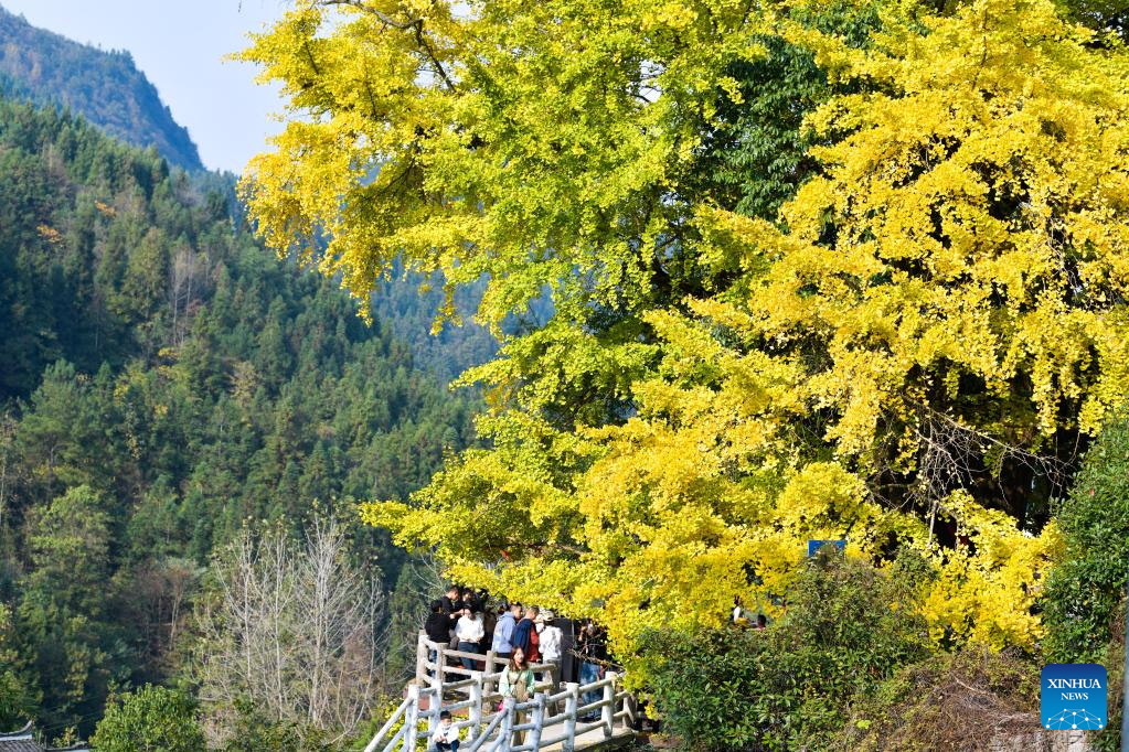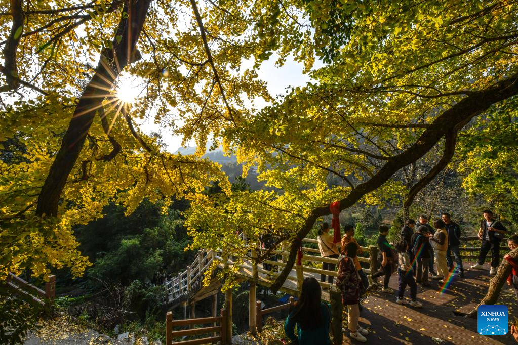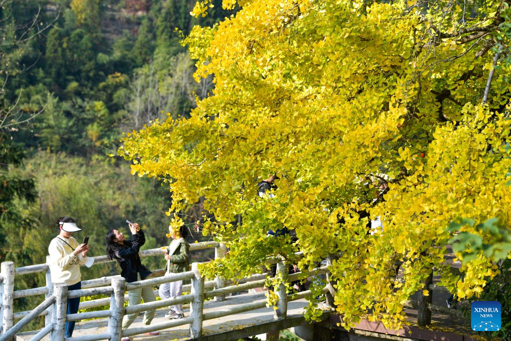 People take photos of a ginkgo tree with golden-yellow leaves in Huanglian Village of Wudang District in Guiyang, southwest China's Guizhou Province, Nov. 6, 2022. (Xinhua/Yang Wenbin)