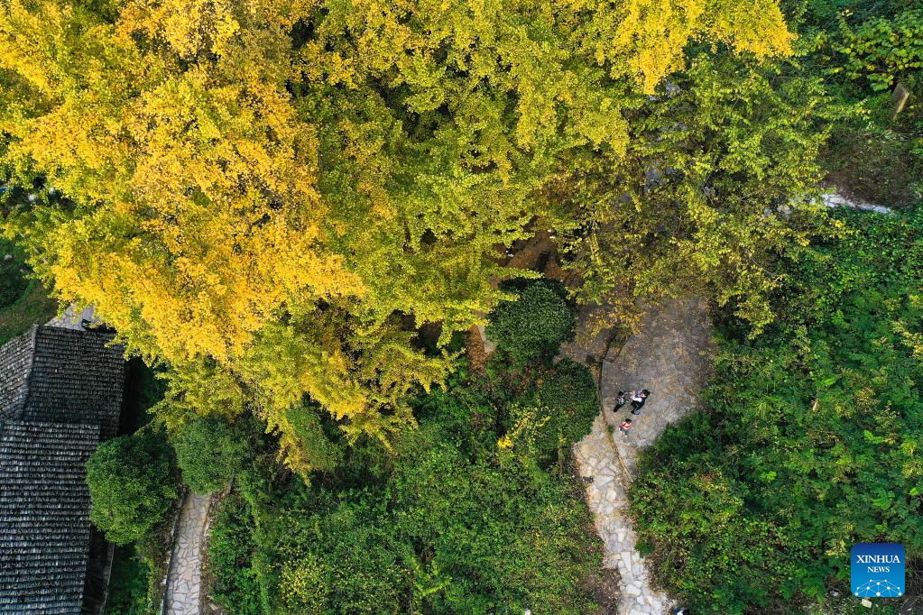 This aerial photo taken on Nov. 6, 2022 shows people enjoying leisure time under a ginkgo tree with golden-yellow leaves in Huanglian Village of Wudang District in Guiyang, southwest China's Guizhou Province. (Xinhua/Yang Wenbin)