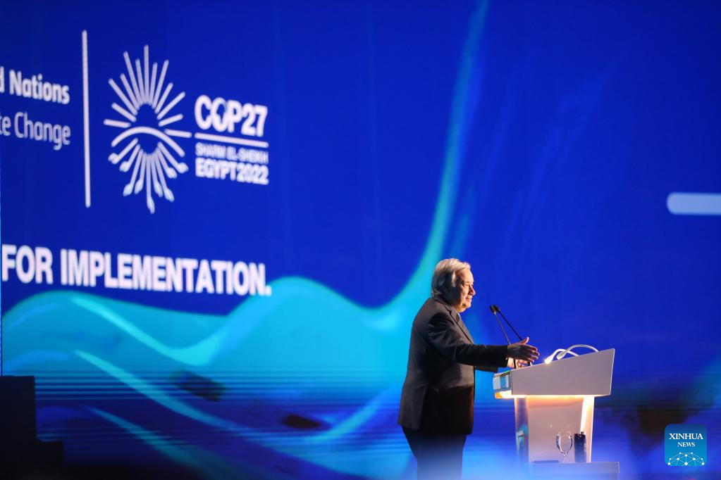 United Nations Secretary-General Antonio Guterres addresses the opening of the Sharm El-Sheikh Climate Implementation Summit (SCIS) during the 27th session of the Conference of the Parties (COP27) in Sharm El-Sheikh, Egypt, on Nov. 7, 2022. Addressing the climate summit, Guterres warned global leaders of the current climate challenges. "We are on a highway to climate hell with our foot still on the accelerator," he said, adding "the planet is fast approaching the tipping point that will make climate chaos irreversible." (Xinhua/Sui Xiankai)