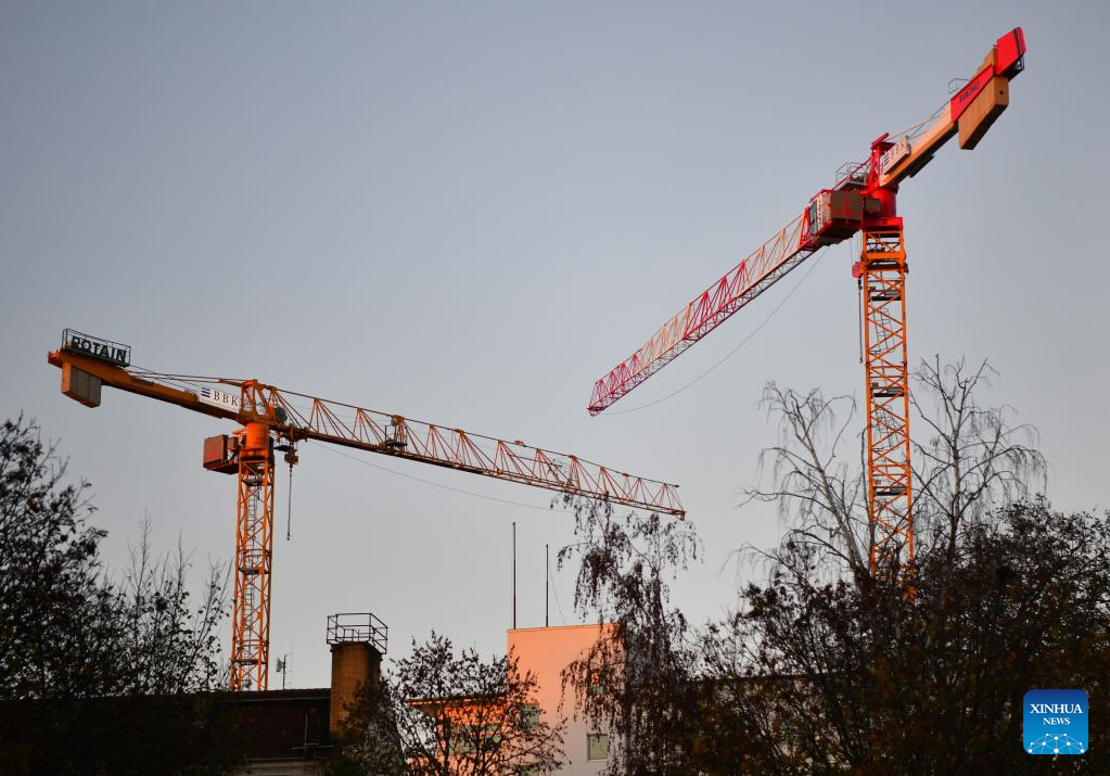 Photo taken on Nov. 6, 2022 shows tower cranes at a construction site in Berlin, Germany. Despite soaring energy prices and ongoing supply chain issues, industrial production in Germany in September increased by 0.6 percent month-on-month, the Federal Statistical Office (Destatis) said on Monday. (Xinhua/Ren Pengfei)