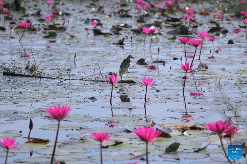A pond heron forages amid blooming water lily flowers in a lake at a village in Morigaon district of India's northeastern state of Assam, Nov. 6, 2022. (Str/Xinhua)